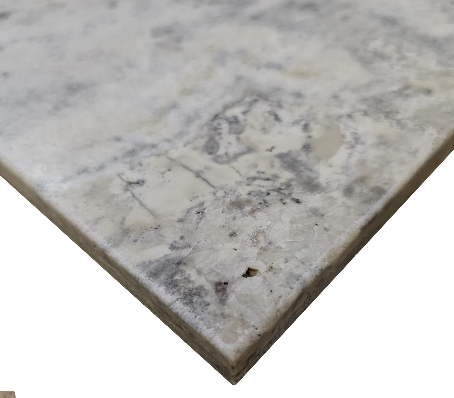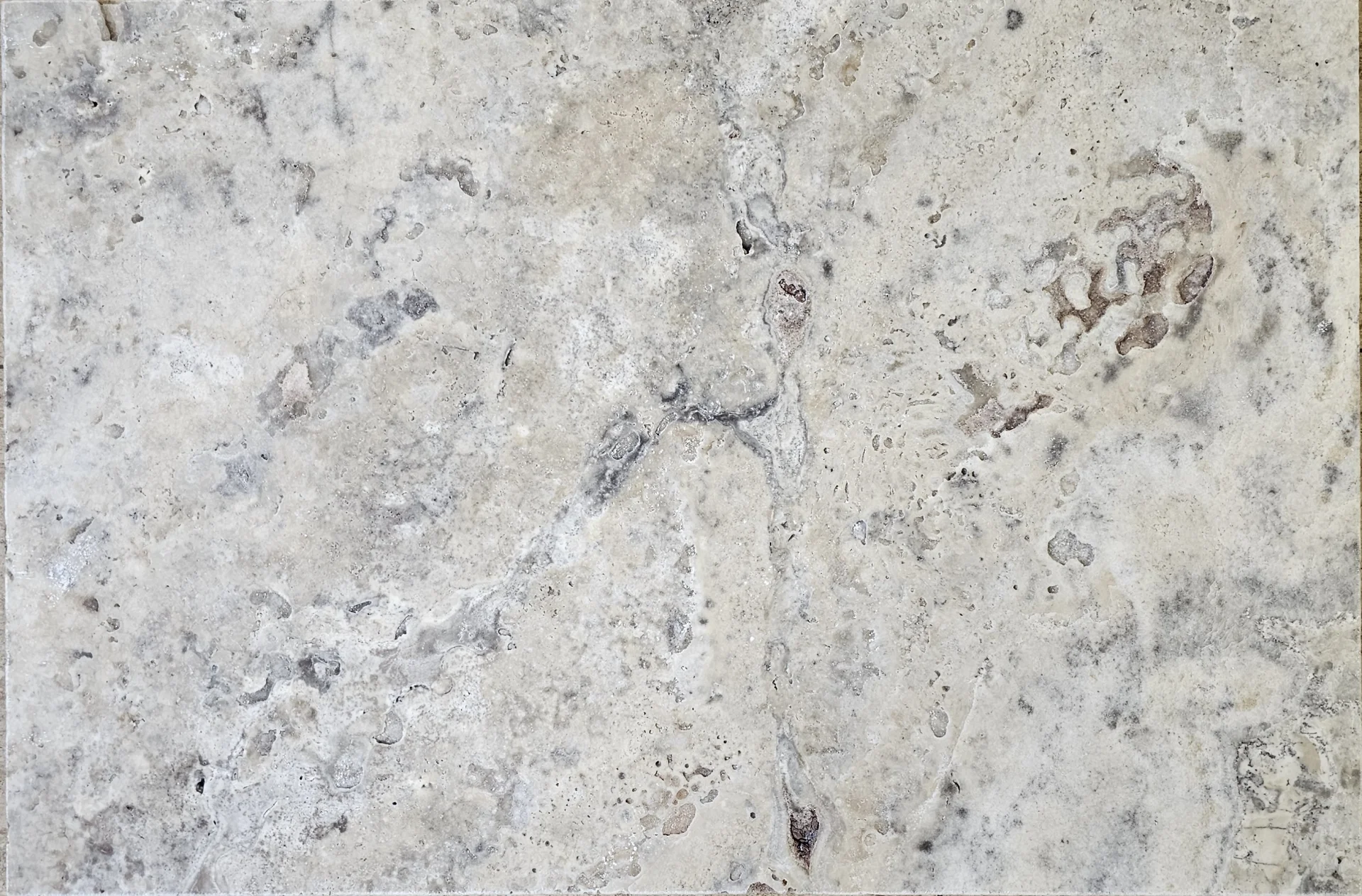 TRAVERTIN SILVER TUMBLED - 40.6X61 cm, finisaj antichizat tumbled, in nuante de gri cu insertii bej si crem, ideal pentru pardoseli sau pereți interiori și exteriori.